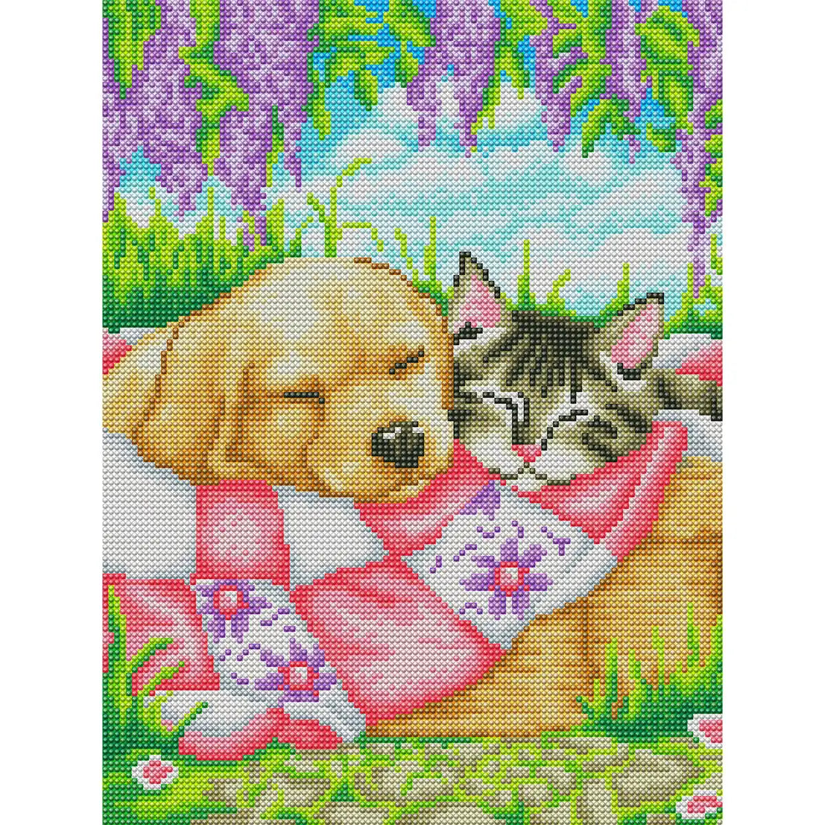 When I place each tiny gem, I can almost feel the gentle warmth between them — a golden puppy and a fluffy tabby cat curled up under a soft pink quilt, wisteria blossoms cascading above. It’s my quiet escape, a few sparkling minutes where the world slows down and all I see is pure companionship.
