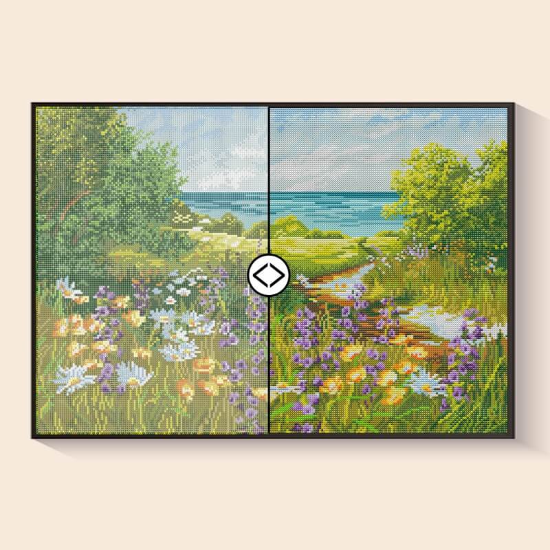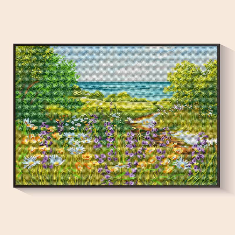As I place each gem, I can almost hear the waves beyond the wildflowers — the salty breeze, the colorful blooms swaying, and the sun lighting up the shore. This seaside diamond art feels like summer in my hands.