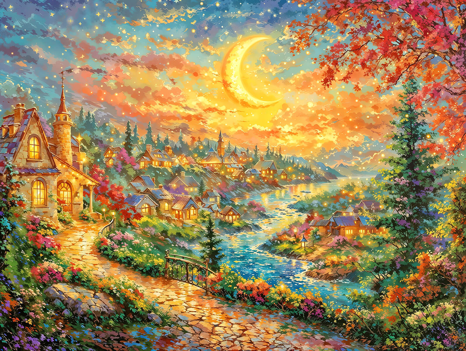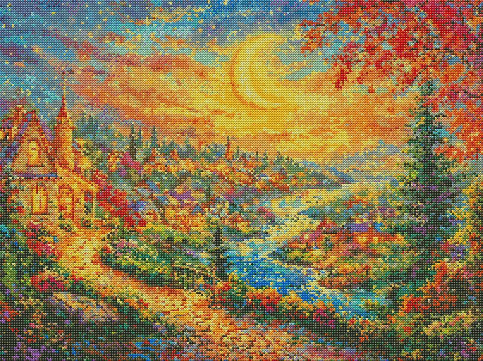 Under a glowing crescent moon, this autumn town sparkles with warmth and magic. As you place each diamond, you’ll feel the rhythm of a quiet village evening—cozy lights, rustling leaves, and a sky full of stars. More than just art, it’s a way to capture the beauty of autumn nights and bring them into your home with every shimmering detail.