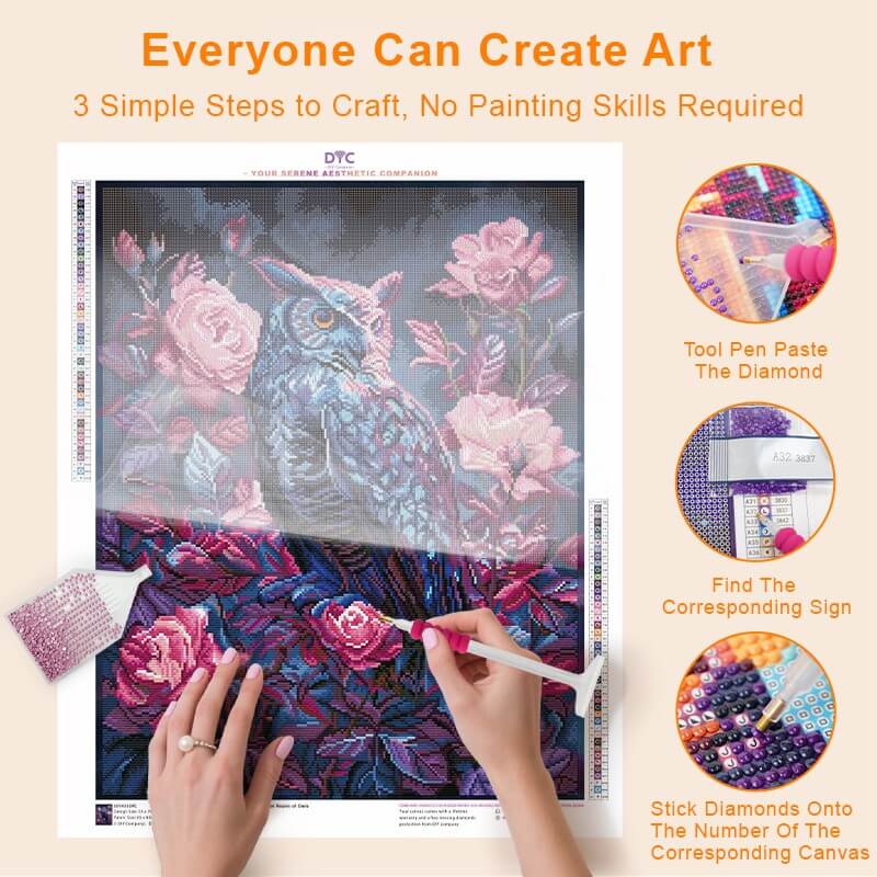 Owls are symbols of wisdom and mystery—here they shine even brighter. With every diamond you place, this owl’s feathers glow against the roses, creating a secret realm of fantasy and beauty. This diamond painting is more than art—it’s a sparkling journey into the magical world of owls.